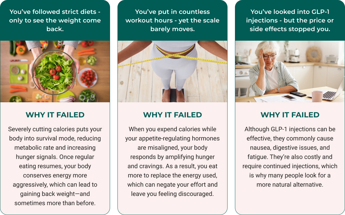 Rather than overriding your body, this GLP-1 supplement works alongside its natural systems - supporting appetite regulation, balanced blood sugar, and healthy metabolic function.