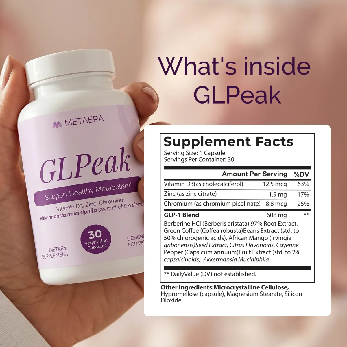 The formula in GLPeak combines several well-researched nutrients - including Berberine HCl, Akkermansia muciniphila, African Mango, Citrus Flavonoids, and Chromium - along with metabolic support compounds like Green Coffee Extract, Cayenne, Zinc, and Vitamin D3. These ingredients have been studied for their role in glucose metabolism, appetite signaling, and metabolic balance. This isn't just another supplement; it's a thoughtfully formulated solution that addresses the root causes of metabolic challenges many of my patients face.