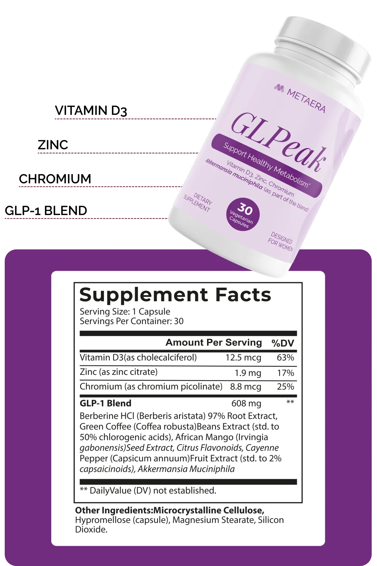 - Berberine HCl: A potent plant compound that supports natural GLP-1 activity, helps maintain healthy glucose levels, and promotes metabolic health and weight management.